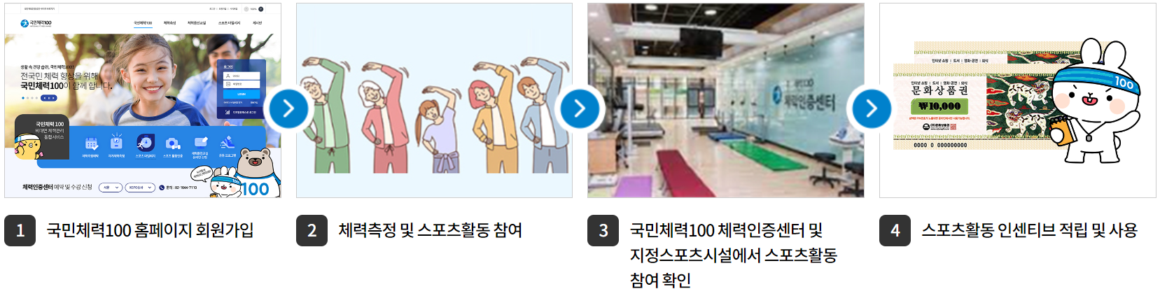 국민체력100의 다양한 체력관리 서비스와 스포츠활동에 참여 후 적립 기준에 따라 인센티브를 지급하고 리워드 상품(문화상품권)으로 교환할 수 있는 대국민 체력증진 서비스입니다.