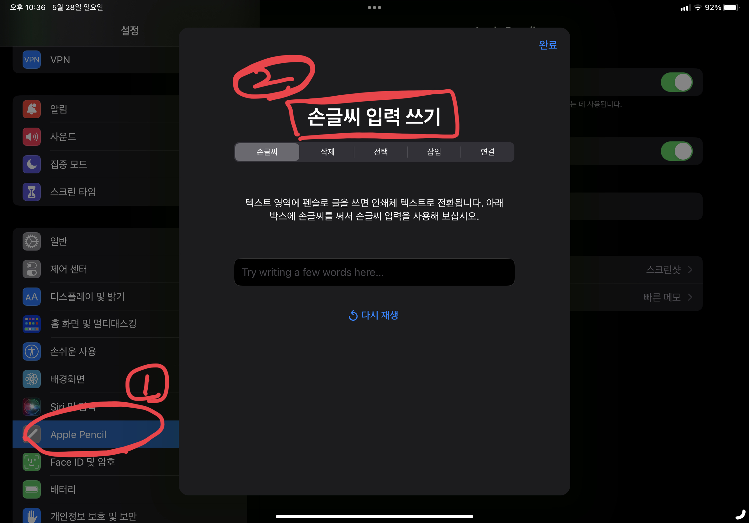가장 쉬운 난이도의 해결법으로 아이패드와 애플펜슬이 제대로 연결되어 있는지 확인합니다.