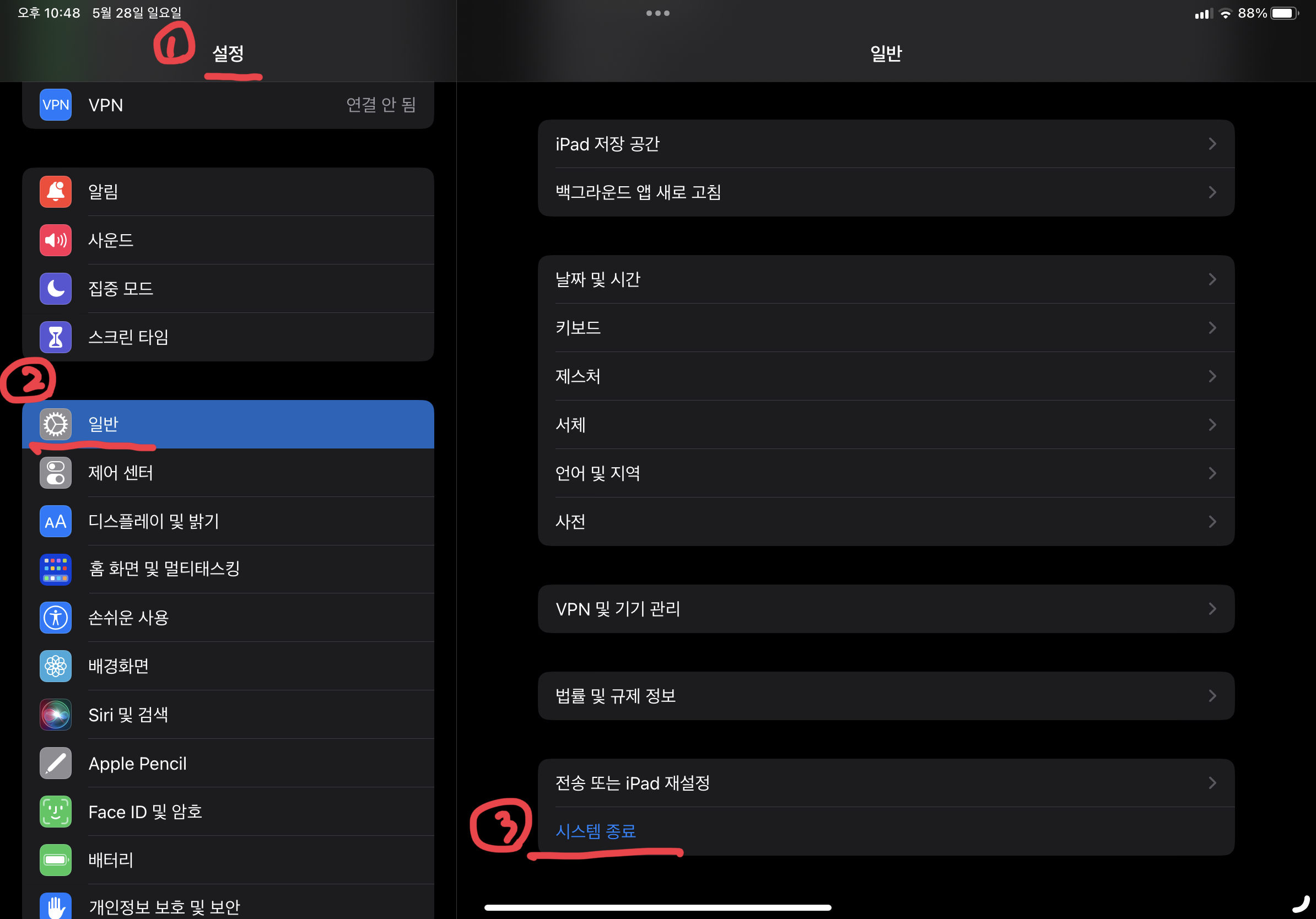 애플펜슬의 문제가 아니라 아이패드의 문제로 필기가 안 되는 경우가 있을 수 있습니다. 그래서 애플펜슬이 써지지 않을 때 아이패드를 재부팅하는 것도 하나의 해결방법이 될 수 있습니다. 전원 끄는 방법은 2가지가 있습니다.