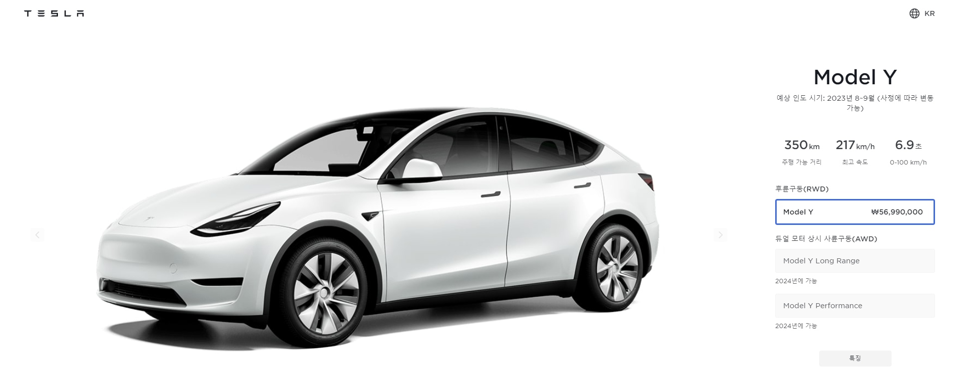 지금 테슬라 홈페이지에 가시면 모델Y의 구매가 활성화되어 있는 것을 확인하실 수 있습니다. 예산 인도 시기는 2023년 8월-9월 사이로 약 한달정도의 대기기간이 필요합니다.