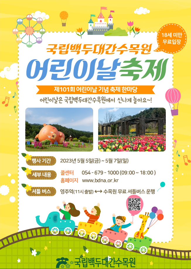 아시아 최대규모 수목원인 국립백두대간수목원에서도 5월 5일부터 7일까지 어린이날 축제를 진행합니다. 성인은 5천 원 어린이는 3천 원의 입장료가 있으나, 축제기간 동안 18세 미만은 무료입장입니다. 국립백두대간수목원의 특이한 점은 바로!!