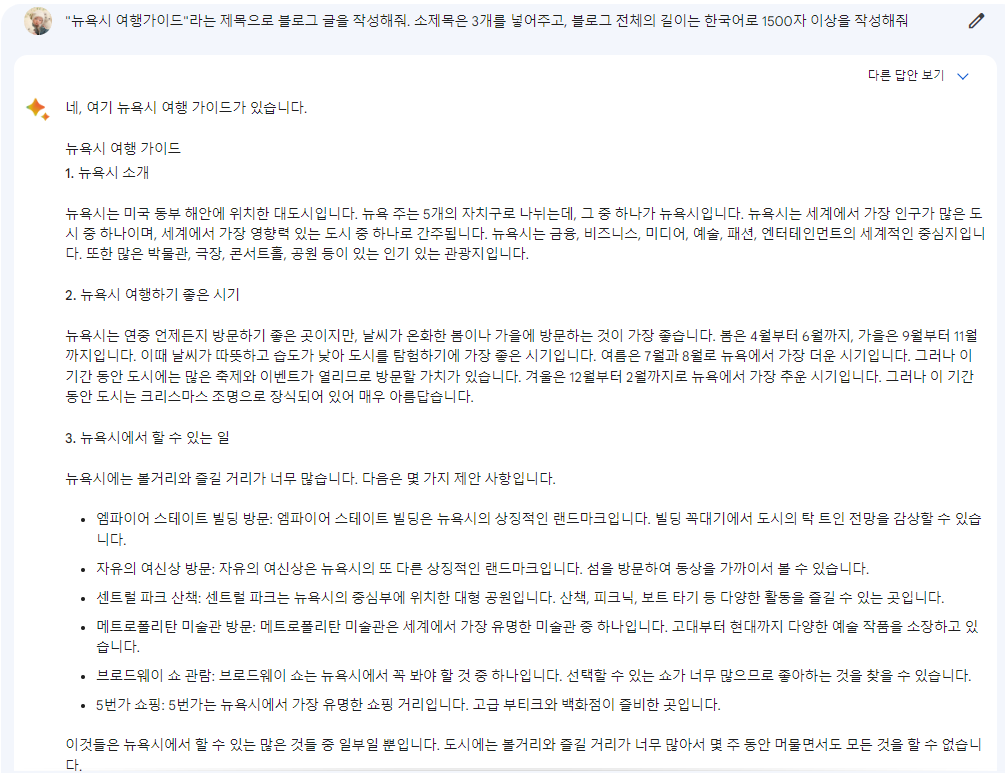 선정한 제목으로 구글 바드에게 블로그 글을 작성하게 합니다. 요구사항을 자세하게 적으면 적을수록 구글 바드는 질문자가 원하는 답에 맞는 답변을 하게 됩니다. 예를 들어 "소제목을 2-3개 넣어서 작성해 줘"나 "글자수는 한국어 글자로 1500자 이상되도록 작성해 줘"같은 내용을 추가해 준다면 좀 더 원하는 답변을 얻어낼 수 있습니다.
