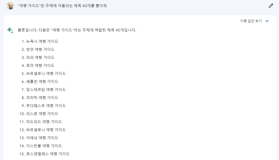 이것 역시 구글 바드에게 물어보면 친절히 대답해 줍니다. 저는 "여행 가이드"란 주제로 제목을 40개 뽑아보겠습니다.